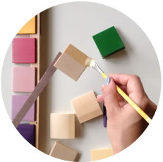 木部の仕上げは、塗装の下地調整としてサンディングペーパー研磨を基本としています。塗装はオイルフィニッシュや蜜蝋などの天然塗料をお勧めしていますが、ウレタン塗装も可能です。オイル着色や色漆などをアクセントカラーにした家具や小物も多数あります。