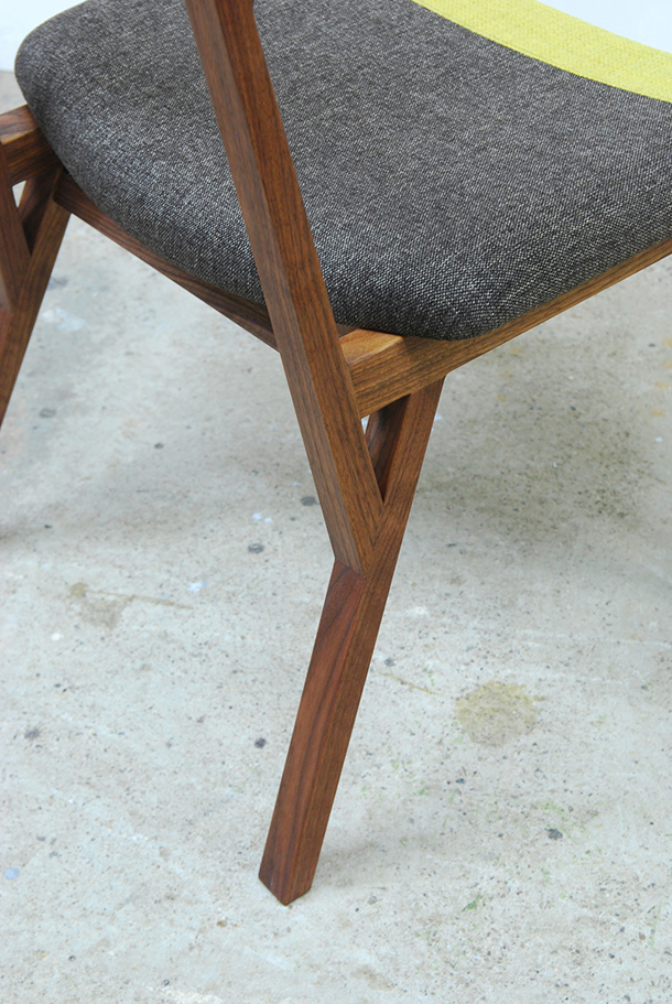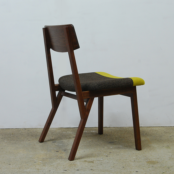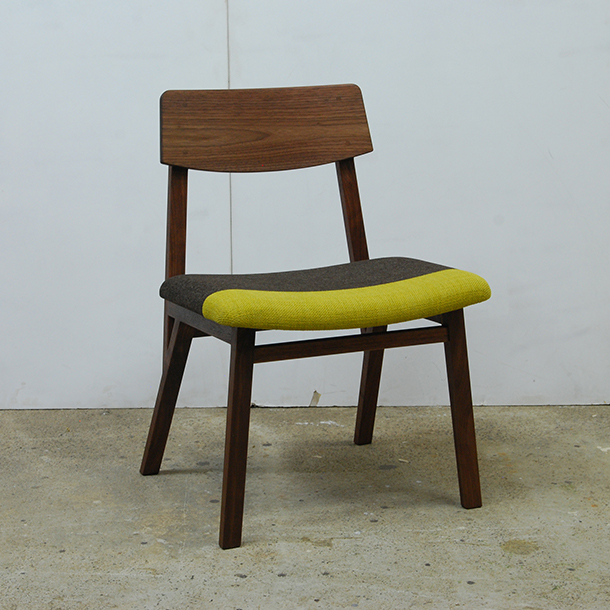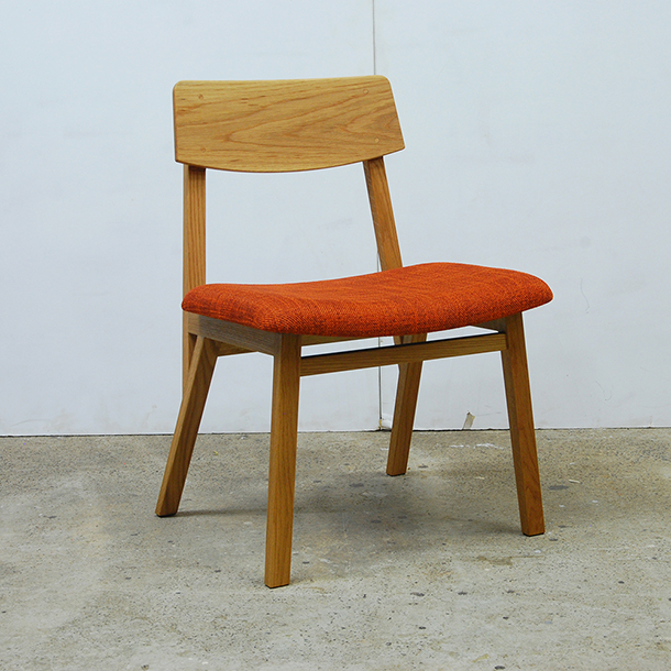 ゆったりと座れるワイドタイプのダイニングチェア。フレームを直線材で構成したシンプルなデザイン。座面のパッチワークや樹種など、ご希望に合わせたセミオーダーが可能。