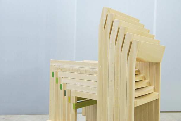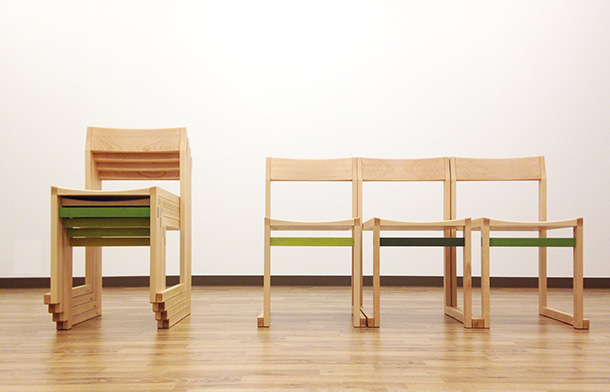 フレームとなる角材と曲面の板材の2種類の材で構成されたスタッキングチェア。椅子単独の姿だけでなく、スタッキングされた状態、連続的に並べられた状態にも配慮した簡潔なデザイン。アクセントとなる貫につけたカラーは、スタッキング時やレイアウト時の連続性に楽しさをプラス。曲面加工した座面と背は、想像以上に優しく身体を受け止めます。