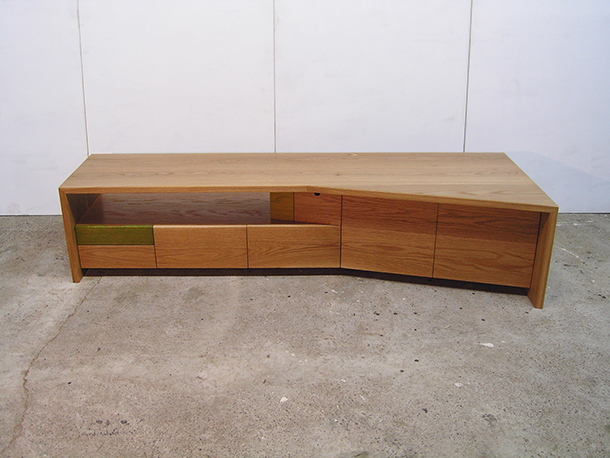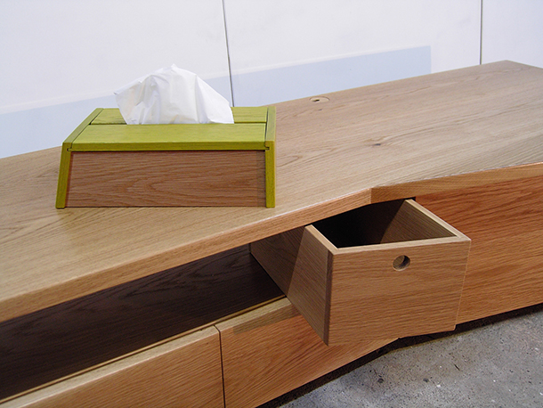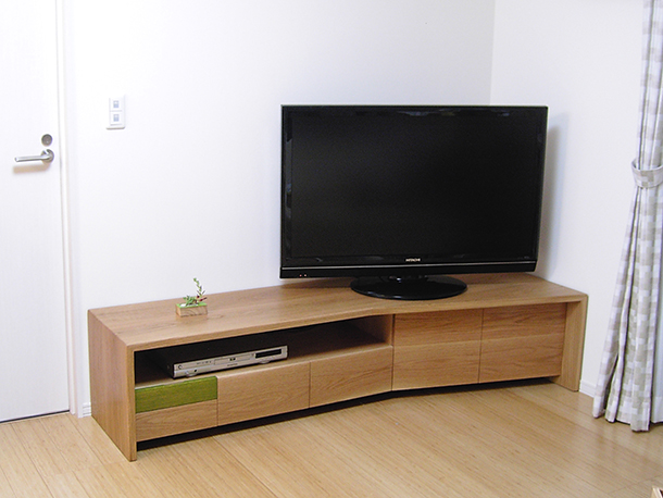 全てオークの無垢材で製作した、引出しと開き戸収納の付いたTVボード。部屋のコーナーに置かれることから、自然な角度でTVが置けるように天板に少し角度を付けました。取外し式のボックスとティッシュボックス付き。