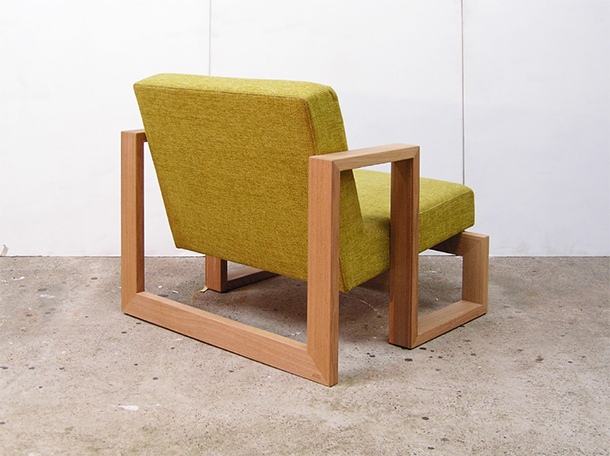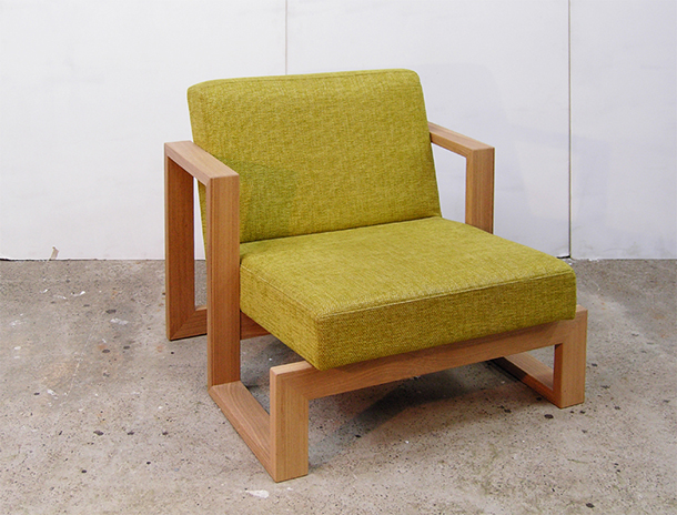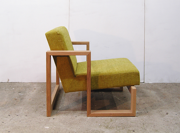 帯状に繋がった木製フレームの中に、L型のクッションが嵌ったデザイン。フレームとクッションをシンプルに組合わせることで、足下をスッキリ見せています。ショートアームにすることで、座り心地と自由な使い勝手を両立しました。